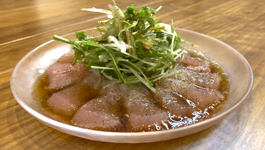 ③マグロを5mm程に切って並べる。水菜と玉ねぎを盛りつけ、調味料(A)をかけて出来上がり。