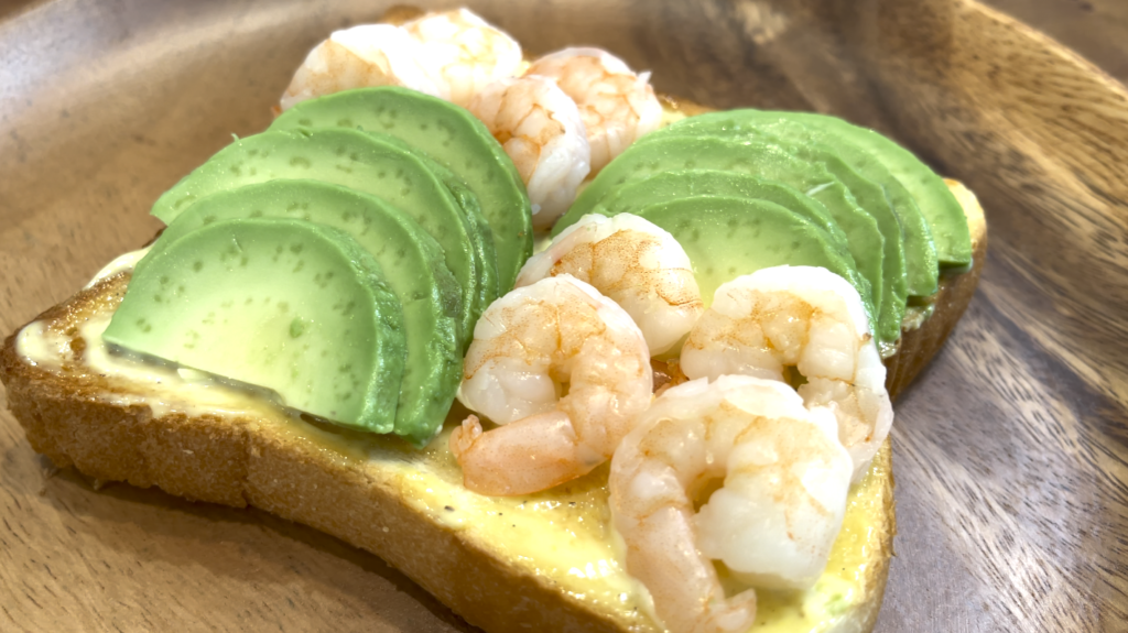 ③トーストした食パンに調味料(A)を全体に塗る。アボカドと海老を並べて出来上がり。