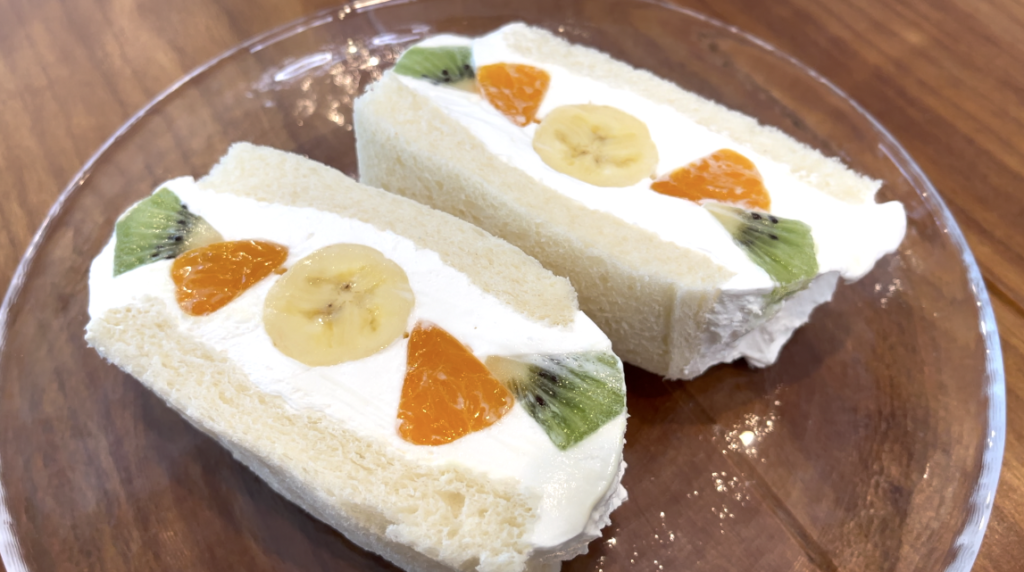 ①パンの耳を切る。バナナは半分に切り、デコポンは皮を剥き、キウイは皮をむいて縦に半分に切っておく。
